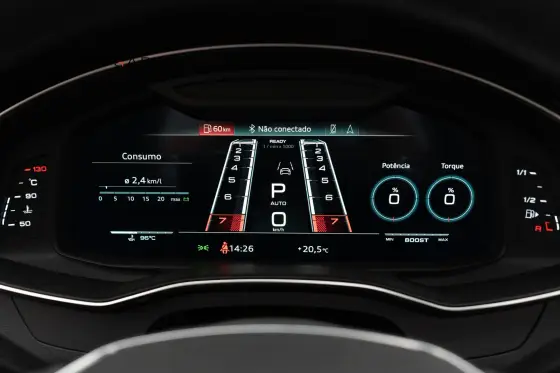 Interior em Couro Valcona Marrom, Acabamentos internos em Alumínio Race, Iluminação ambiente configurável, Painel de instrumentos digital, Head-up display, Sistema de som Bang & Olufsen, Teto solar duplo, Carregador wireless, Cortinas para segunda fileira, Bancos dianteiros com ajustes elétricos climatizados e memória, Controle de cruzeiro adaptativo, Eixo traseiro direcional, Sistema de escapamento ativo Outros Opcionais: Banco bi-partido, Comando de áudio no volante, Controle de estabilidade, Direção Elétrica, Distribuição eletrônica de frenagem, Farol de neblina, Kit Multimídia.
