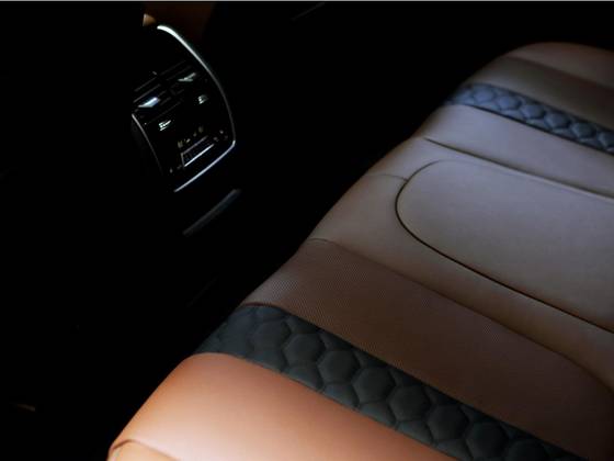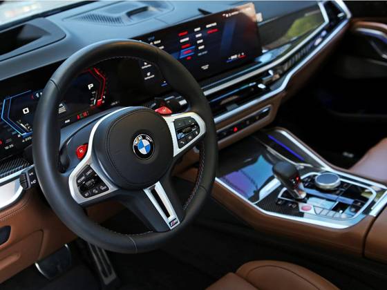 Veículo na cor cinza Brooklyn, rodas de liga leve exclusivas do modelo, teto solar panorâmico, bancos em couro Merino marrom e preto, painel Live Cockpit Professional com visor curvo, Head up display, acabamentos em fibra de carbono e sistema de som Bowers & Wilkins.