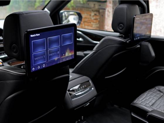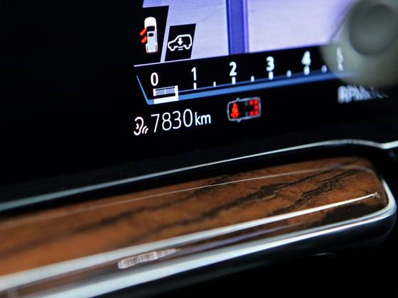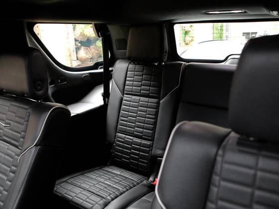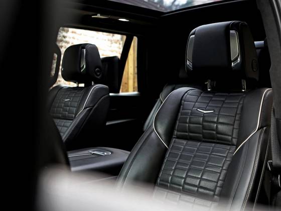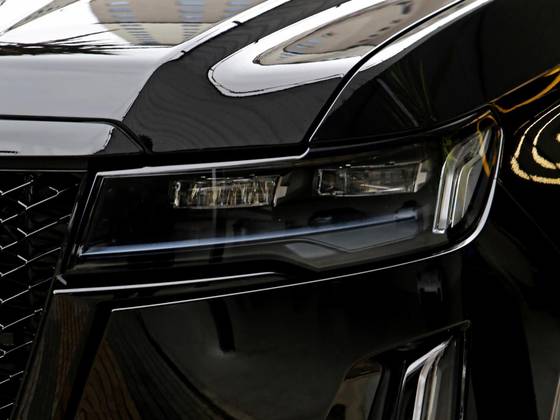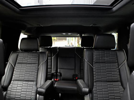 Veículo 7 lugares com blindagem Cart, vidros Agp, rodas em black piano, teto solar panorâmico, bancos em couro preto, acabamentos em madeira, telas de entretenimentos traseiras e sistema de som AKG.