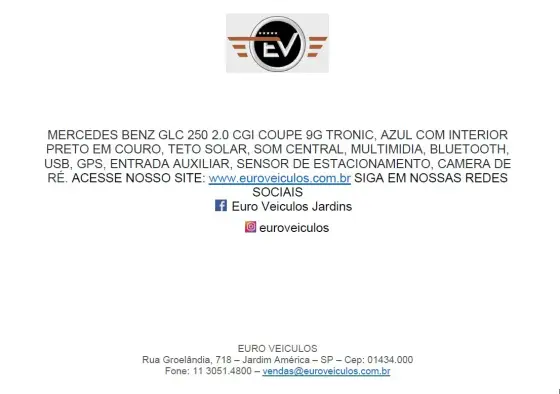 MERCEDES BENZ GLC 250 2.0 CGI COUPE 9G TRONIC TETO SOLAR AZUL COM INTERIOR PRETO EM COURO SOM CENTRAL MULTIMIDIA BT USB GPS ENTRADA AUX SENSOR DE ESTACIONAMENTO CAMERA DE RE FALAR COM EDUARDO OU TATO Outros Opcionais: Assistente de Partida em Rampa, Banco bi-partido, Comando de áudio no volante, Controle de estabilidade, Direção Elétrica, Farol de neblina, Kit Multimídia, MP3 Player, Pára-choques na cor do veículo, Porta-copos.