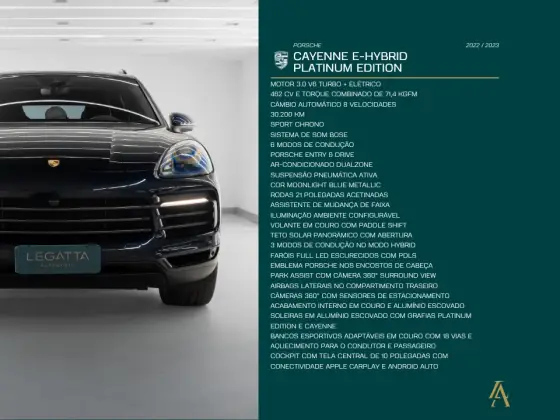 Equipado com Sport Chrono, Sistema de Som Bose, Porsche Entry & Drive, 6 Modos de Condução, Ar-condicionado Dualzone, Cor Moonlight Blue Metallic, Suspensão Pneumática Ativa, Rodas 21 Polegadas Acetinadas, Assistente de Mudança de Faixa, Iluminação Ambiente Configurável, Volante em Couro com Paddle Shift, Teto Solar Panorâmico com Abertura, Faróis Full LED Escurecidos com PDLS, 3 Modos de Condução no Modo Hybrid, Emblema Porsche nos Encostos de Cabeça, Airbags Laterais no Compartimento Traseiro.
