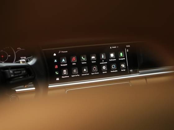 Veículo rodas em black piano, teto solar duplo, bancos em couro bege, pacote Sport Chrono e sistema de som Bose.