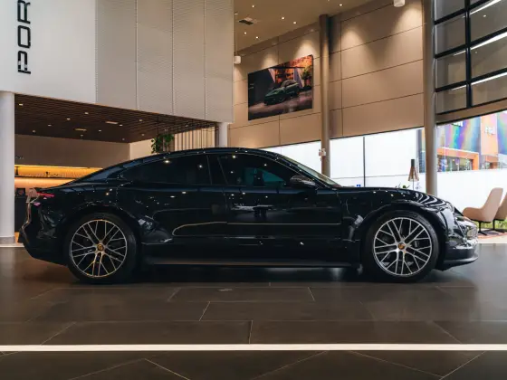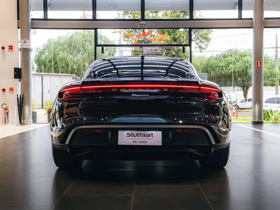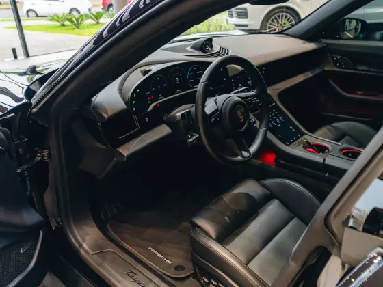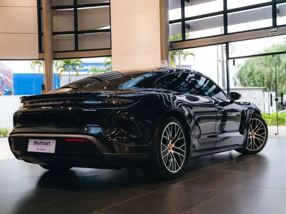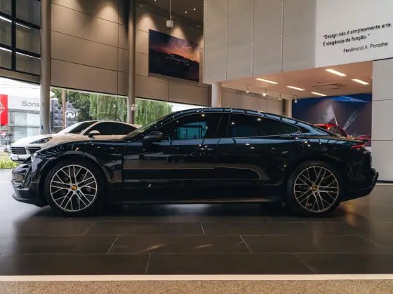 Preto Jet metálico com a interna parcialmente em couro. Rodas Taycan Turbo Aero de 20 polegadas, Bancos esportivos Plus adaptativos de 18 vias com pacote de memórias, revestimento superior dos retrovisores externos e aerofólio em fibra de